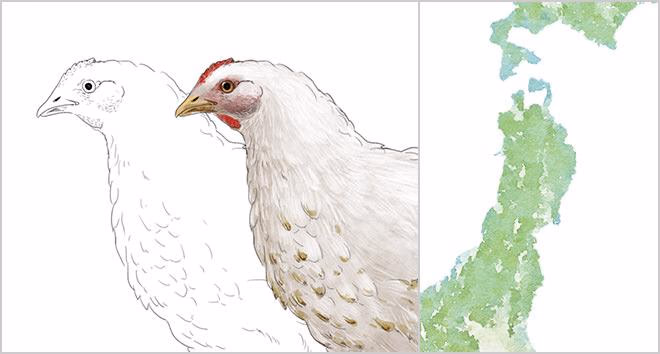 However, just displaying local chicken and local specialties is a little boring. Isn't there a way to visually express the land and local chicken in a more understandable way? The result of thinking was the idea of an "illustrated guide." The local chicken is laid out against a map background, and its characteristics and introduction are written. By doing this, it becomes something extra that goes beyond just receiving it. That's what I thought.
