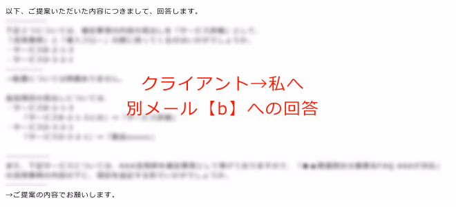 2) From the client to me: The reply email to [a] contains a response to another email [b]