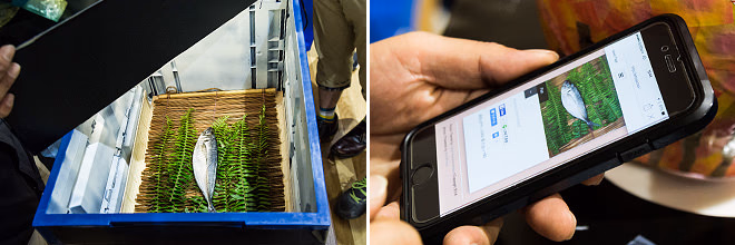 The "Phoya System" allows users to adjust the lighting on their smartphone to take photos that best match the shape and color of the fish, and the images they take are automatically uploaded to the website and messenger tool.