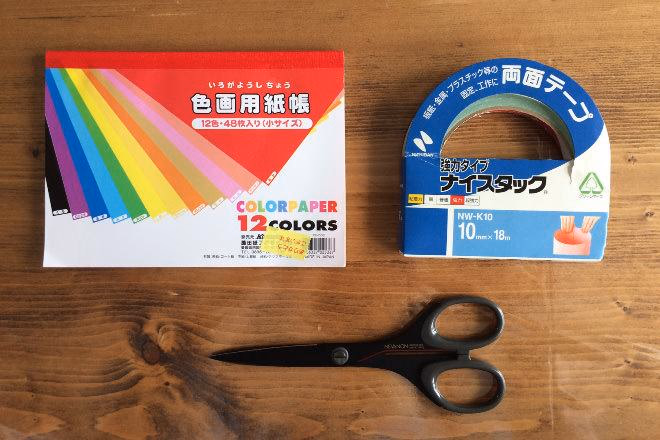 The tools I used were: colored paper, double-sided tape, and scissors.
