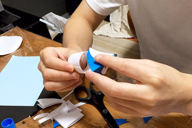 The eyes and nose are small parts, so I used the same strategy of sticking paper to tape and then cutting. For the ears, I made a cut in the middle and layered them tightly inwards to create a three-dimensional effect.