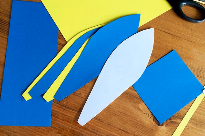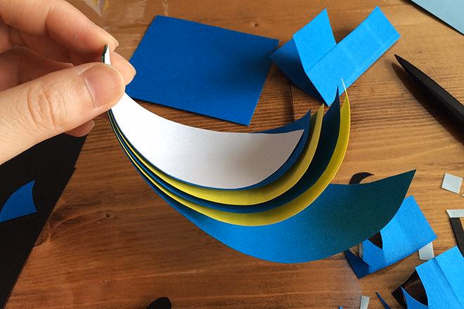 I stuck the blue and yellow on alternately. After this, I stuck the back of the ears in the same way.