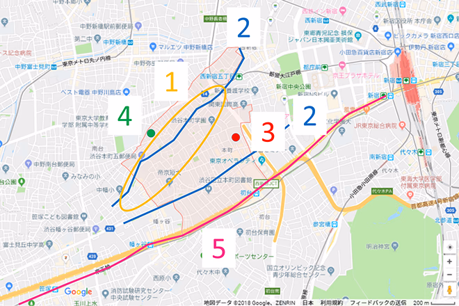 The area surrounded by a red frame is "Honmachi" in Shibuya Ward.