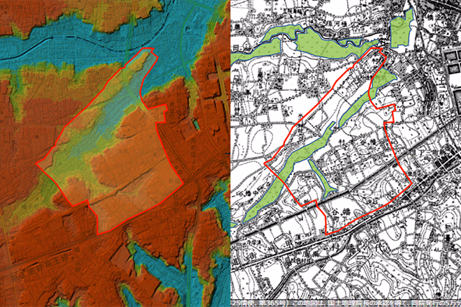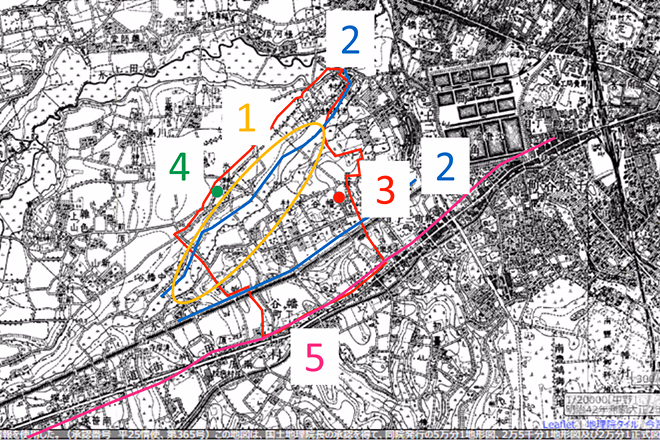 Looking at the map from the Meiji period shown on the right, we can see that the valley in the center was indeed used as a rice field.