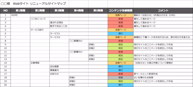 Status types・New page: A new page that does not exist on the current site ・Renovated page: A page that will be partially or completely renovated ・Transitioned page: A page whose design will be changed but whose content will remain the same as the current page ・Integrated page: A page that will be merged with another page ・Deleted page: The entire page will be deleted