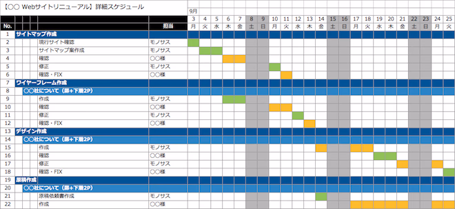 By creating a schedule, you can clearly see what needs to be done and when. Even if it is difficult to deal with something in a time frame, it will be easier to come up with early countermeasures, such as securing additional resources or reconsidering the system.