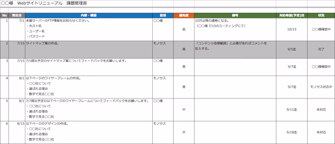 The last of the five things to do in the early stages is to create an issue management table to be shared between the client and internal members. This will also be based on the issue list mentioned above, and will be created in a way that makes it easy to update the issue status and share it with the person in charge.