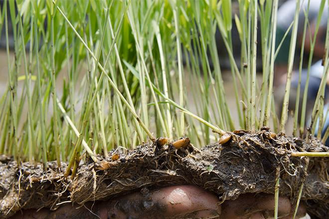 After planting, a task called "weeding" is required to mix the grass and soil together to prevent unwanted weeds from sprouting.