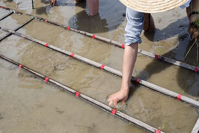 Shrimp?! Are they okay? Well, it turns out that the shrimp stir up the water, which mixes up the soil and makes it harder for grass to grow. Because of this, the weeding that was previously required 10 days after planting is no longer necessary, and only water management is required.