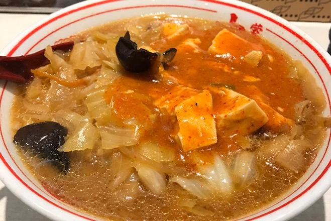 Mongolian Tanmen, spiciness level 5, 800 yen. Miso tanmen topped with mapo tofu, a popular staple menu item at Nakamoto.
