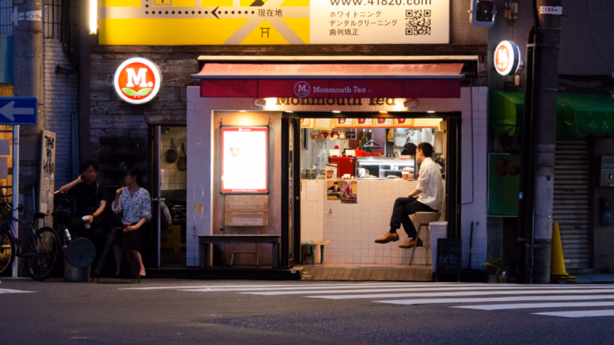 Monmouth Street in London and Sendagaya in Japan. They are similar in that they are both at the intersection of many streets and there are no tall buildings around. That's why the shop was named "Monmouth Tea" after the name of the street.