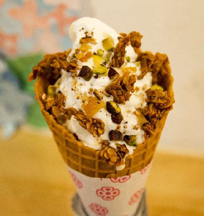 Among the many menu items at Lettier, the most popular is the honey and three kinds of nut soft serve, inspired by the French dish nougat glacé*.