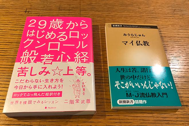 みうらじゅんの「マイ仏教」と、二階堂武尊の「29歳からはじめるロックンロール般若心経」 「マイ仏教」は、著者のエピソードをベースに語られていて、面白くてするすると読み進められます。 「29歳からはじめるロックンロール般若心経」は、般若心経の教えを現代流に分かりやすく解説してくれて、日々の悩みが馬鹿馬鹿しいものだと思わせてくれる一冊です。 持参した他の二冊に関しては、断食道場の本棚に寄付してきたので今は手元にはありません。