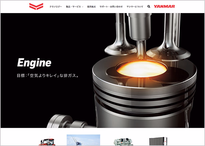 【他社制作事例】ブランドステートメントに加えて、製品カテゴリ毎にコピーとダイナミックな写真で表現し、志の高さと技術力が伝わるメインビジュアルになっている。