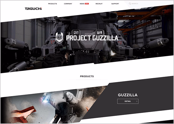 【他社制作事例】斜めのグリッドも珍しいが、写真加工が特に印象的。やりすぎとも思えるエフェクトが、マシンのパワーを感じさせ、製品の特性と非常に噛み合っている。