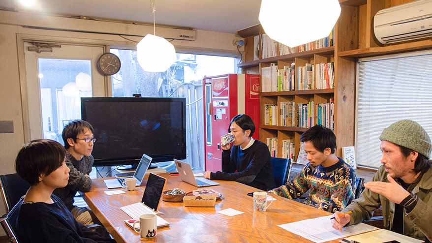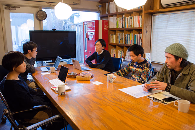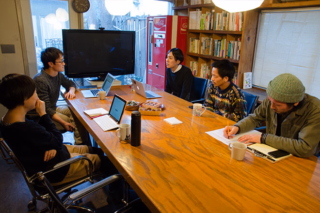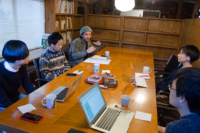 対談の会場であるNorth棟会議室に揃ったデザイン部メンバー。左かから中庭、小野木、今井、上森、榛葉