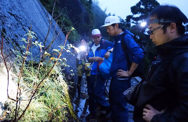 荒川登山口に到着するも、あたりはまだ真っ暗。暗い中、出発時の集合写真を撮り、ヘッドライトや懐中電灯を手にトロッコ道を進みます。