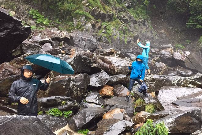 こんな岩を超えて滝つぼまで向かう途中、自撮りに夢中になるメンバーと私