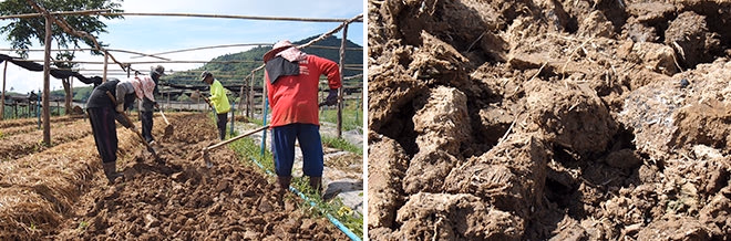 (左)暑い中タイ特有の粘土質のある赤土を耕す農家さん。(右)画像ではちょっとわかりにくいですが、土壌を作るためにもみ殻のはいった栄養豊富な土で作られています。