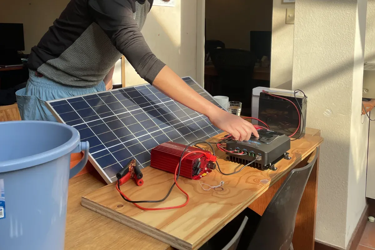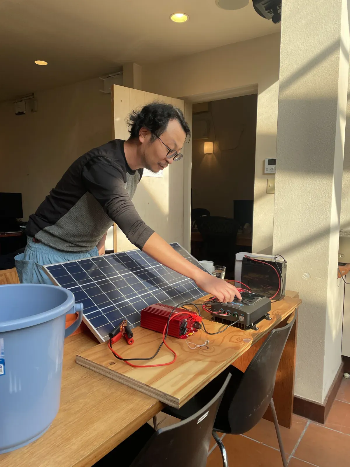 こちらのコーナーはモノサスの各拠点から届く日々のひとコマを紹介しています。 今回は1月の代々木オフィスより、最近のひとコマをご紹介します。 エントランスのカーテンが外れ、突然元気な日差しが差し込んできたので、思わず自家発電ソーラーパネルを取り出した松永さん。どれくらい電力が溜まるかな?オフグリットサイトへの道のりは続く。。 中庭 佳子