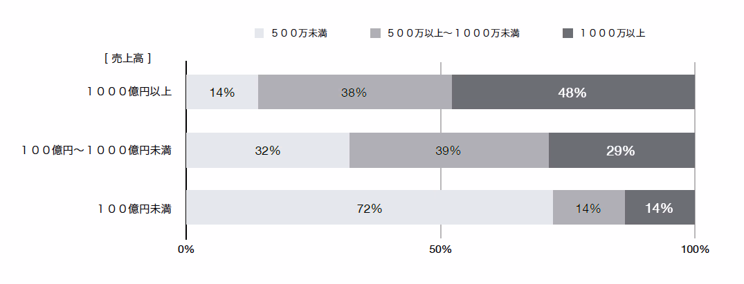 リニューアル予算は企業規模に比例しており、売上1000億円以上の企業は、48%の企業が1,000万円以上の予算をかけると回答しています。