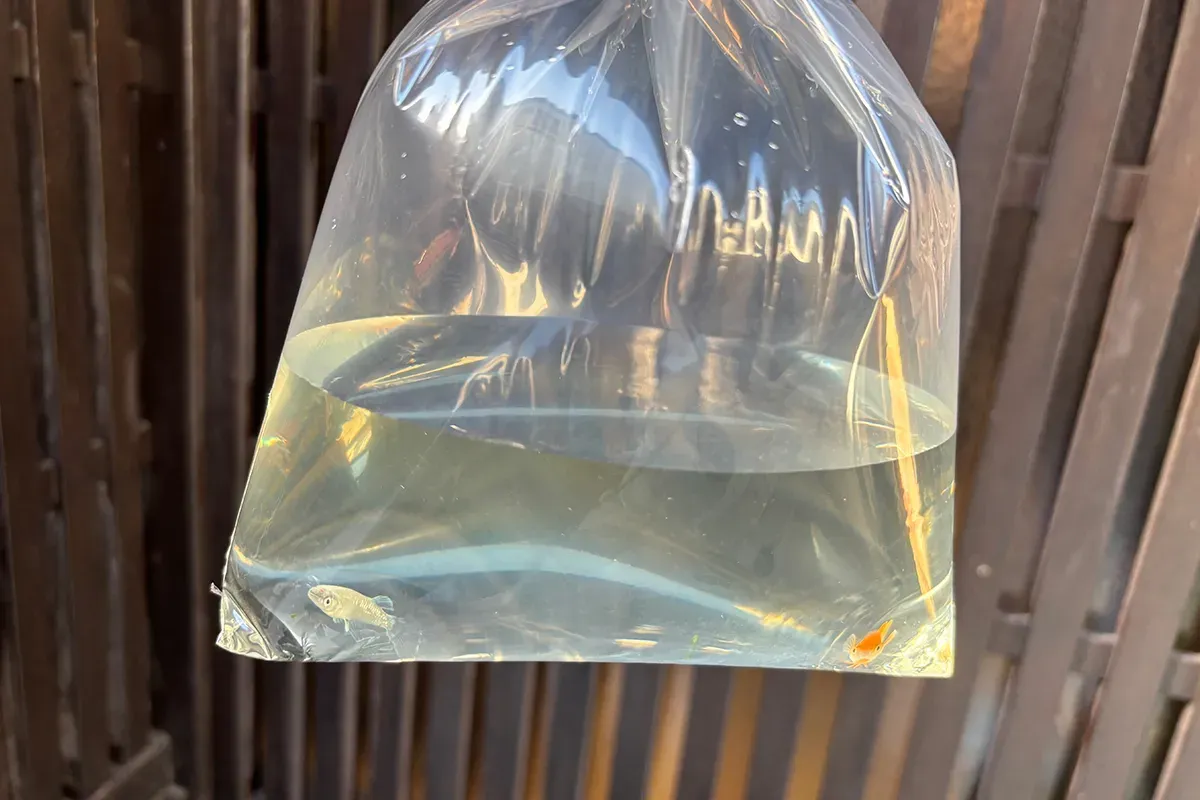 袋のまましばらく水面に浮かべ、水温に慣らしてから、作ったお家に放流します。
