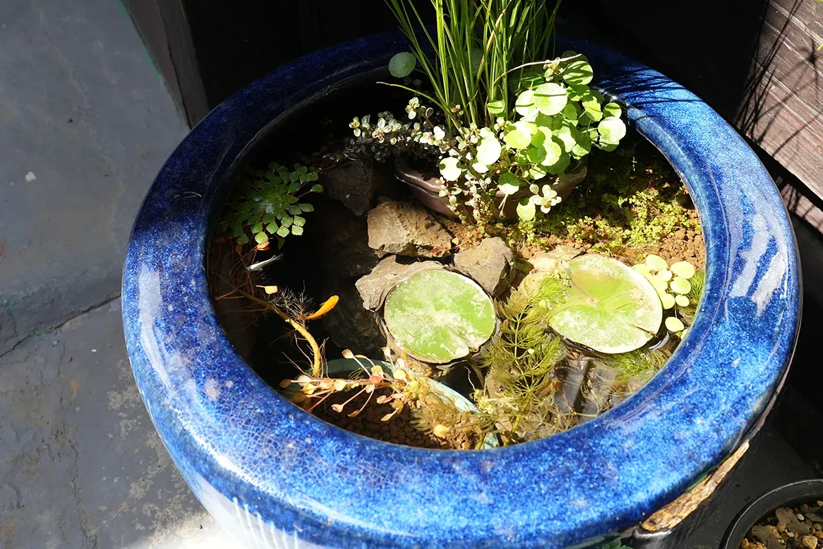 いろんな種類の植物が生えていて、岩や流木が置かれたお家。