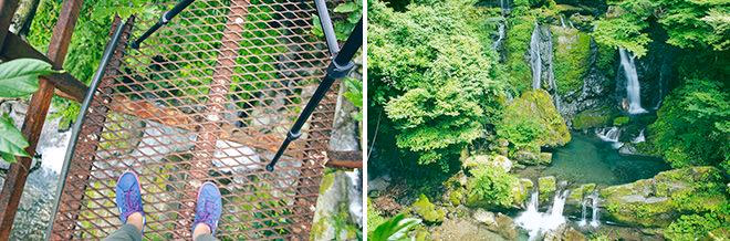 7月下旬、スキーランド近くの上流(左上)と定員5人の橋の上から撮影した三ツ木滝(右下)。錆びついた橋は適度に揺れて恐怖そのものでしたが、自身の写真にかける情熱で乗り切りました(笑)。真夏でも涼しくて気持ちが良いです。