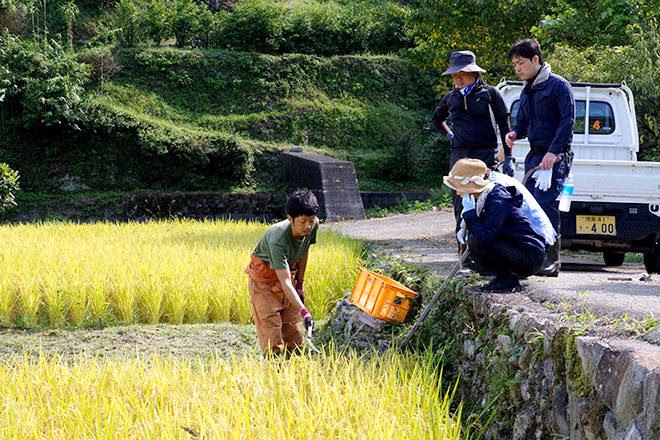 江田集落の棚田で稲刈り(9月上旬)。地域おこし協力隊の植田さんから作業前に刈り方を教わる様子。この日は稲刈りから「はざかけ」まで全て手作業でお手伝いしました。