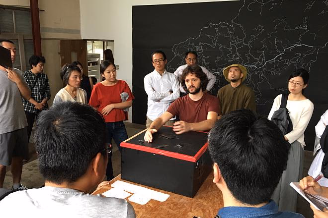 9月下旬、KAIRのオープンアトリエにて。参加者に対し、「記憶」をテーマとした映像投影を行うインスタレーション作品の構想を説明するPabloさん。