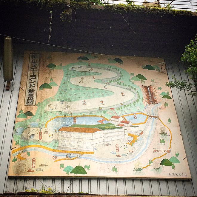 スキー場だった頃の看板。なんとも味があります。