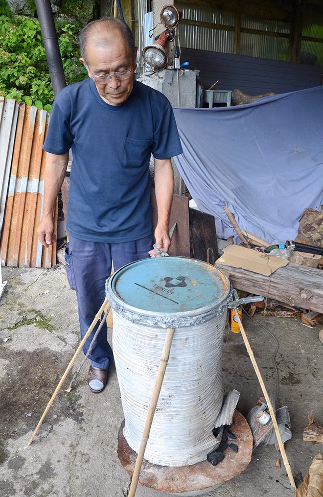 ダクトを改造したお父さんお手製の燻製機で、じっくりと燻します。