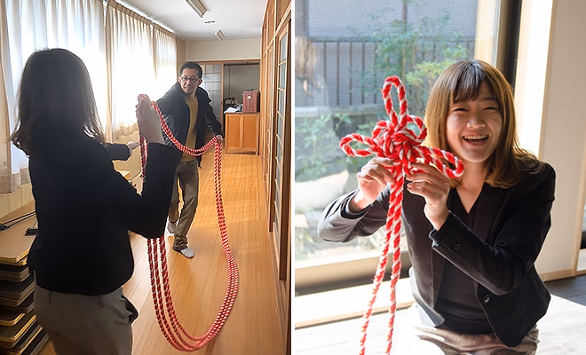 オフィスプレートの除幕セレモニー用の紐結びに悪戦苦闘しながら、ようやく完成!