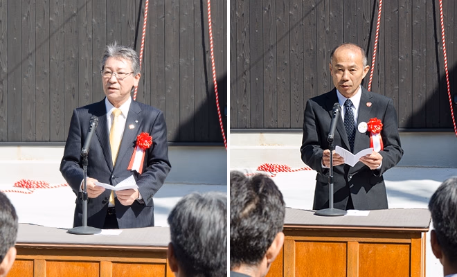 歓迎と激励の御祝辞をいただいた、(左)周防大島町長 椎木巧様と(右)山口県知事 村岡嗣政様代理の山口県柳生県民局長 吉岡達也様