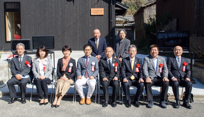 左から地家室自治会長 松井秀文様、柵山、永井、林、県知事代理の山口県柳生県民局長 吉岡達也様、周防大島町長椎木巧様、周防大島町議会議長の荒川政義様、周防大島町コミュニティ協議会議長新山玄雄様。後方は永井の親戚の川田さんと高田さん