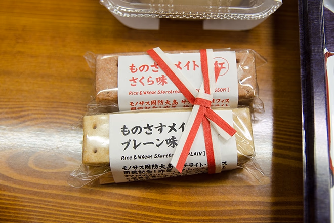 ものさすメイトは、徳島県神山町でモノサスが携わる農業法人 フードハブ・プロジェクトのパン屋、かまパンで販売する米粉と米ぬかで作るお菓子「カミヤマメイト」を特別に「ものさすメイト」として作ってもらったもの。パン職人が、昨年モノサスメンバーが神山で作ったものさす米から作ってくれたのです。さくら味とプレーンの紅白の色がおめでたいです!