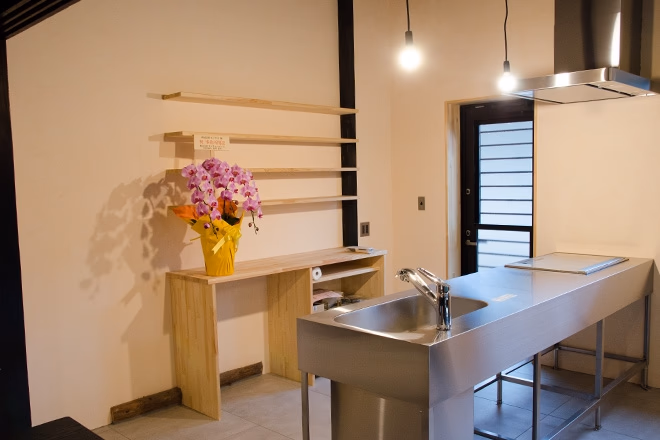キッチン奥のドアの外には、これから畑ができる予定なのだそう。キッチンガーデンつきオフィスです!