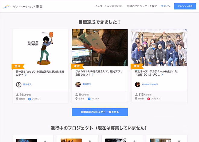 リニューアルをしたイノベーション東北のサイト。閲覧当時、ジョセソンのチャレンジは募集中だったが、現在は「達成」にステータスが変わっている。(2016.03.29現在)