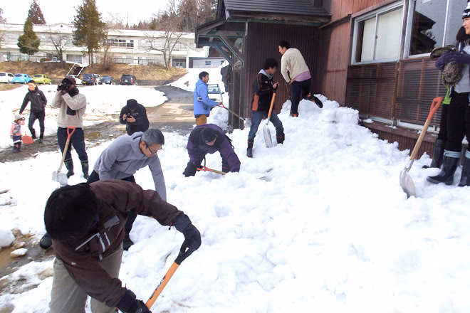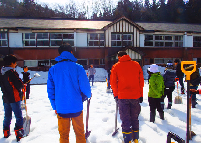 入念に体を温めた後は、腰を痛めないためのジョセササイズの基本動作や、どういう動作がどこの筋肉に作用するのかという実技を教えてもらい、実際に西会津国際芸術村の除雪をはじめます。