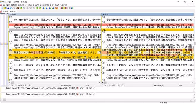 続いて、作業前と作業後のソースを winmerge で比較します。